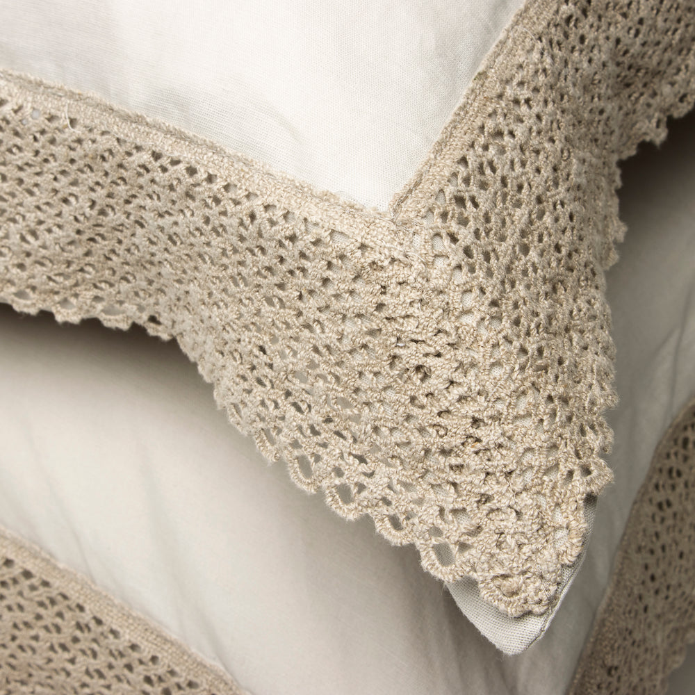 Una pieza esencial de la colección Vivenda Linos. Su combinación de lino y percal en gris bruma, con delicadas tiras bordadas, ofrece una textura rica y fresca que eleva cualquier cama con elegancia natural.
