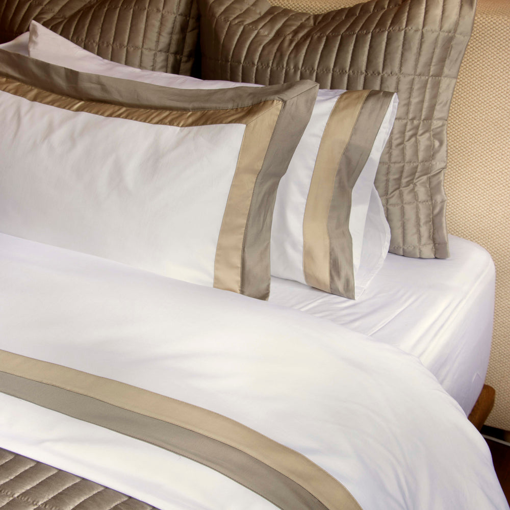 • 1 Juego de Sábanas 420 hilos Blanco con Tira Doble Olmo + Khaki y 2 Fundas de Almohada.